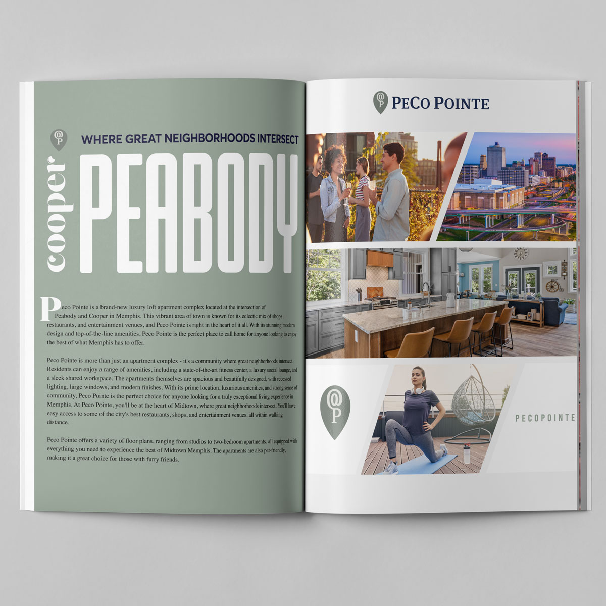 The branding for Peace Pointe Loft was designed to encapsulate the essence of modern urban living while respecting the historic charm of Midtown Memphis. The logo features a clean and elegant design, complemented by a sophisticated color palette of muted greens and blues. This visual identity was meticulously crafted to convey a sense of exclusivity and contemporary style, resonating with the diverse demographic the loft aims to attract.